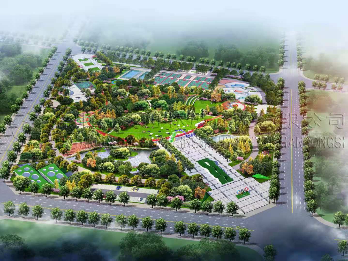 設計依托城市規(guī)劃的總體定位,“以健身運動為主,集體育、健身、休閑、娛樂為一體的開放性公園綠地”以足球、籃球、羽毛球、網球、排球、門球、健身路徑等露天戶外運動項目為主。